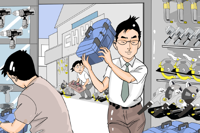 철두는 배달된 제품을 들고 이리저리 왔다갔다 끙끙거린다. 이미 가게는 사람이 들어가는 것도 어려울 정도로 비좁아졌다. 천장에도 나무에 열매가 달린 것처럼 공구가 주렁주렁 빽빽하게 매달려 있다.