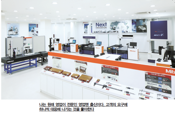 “미쓰도요 제품은 크게 측정공구와 기기설비 파트 두 가지로 나뉜다. 측정공구는 늘 많은 분들이 애용해 주고 있지만, 기기 쪽은 다른 외국 브랜드가 성장하면서 상대적으로 미쓰도요의 입지가 약해져 그걸 강화하려는 계획을 세웠다. 제품이나 품질의 문제가 아니라 시장침투력의 문제라고 생각했다. 그래서 그 부분에 노력한 결과 예전엔 측정공구의 비율이 높았지만, 최근에는 거의 비슷해졌다. 측정공구도 점점 다양한 기종이 판매되어 측정기기의 주요상품 중에는 매출이 두 배로 성장한 것도 있다.”