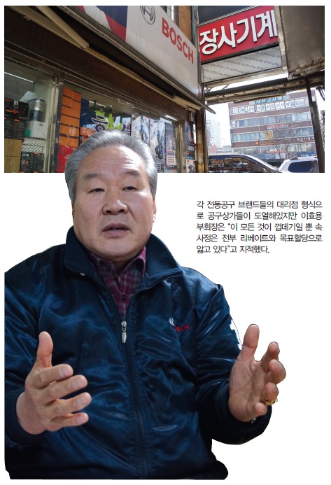 그러면 그만두면 되지 않느냐고 속 모르는 남들은 말할 것이다. 하지만 사는 것이나 일하는 것이나 한번 그 버스에 올라타면 내리기가 쉽지 않다. 자기도 모르게 계속 바퀴를 굴리도록 만드는 것이 자본의 속성이고 돈의 마력이다. 밑져도 팔아야 하는 전동공구 시장의 작금의 현실을 이효용 한국산업용재협회 부회장을 통해 들어봤다. 이 부회장은 유통질서심의위원회 부위원장직도 맡고 있다. “전동공구 제조사의 대리점 계약조건, 리베이트 유혹 때문에 업계 질서가 무너지고 있다”며 “판매자인 우리 스스로도 자정능력이 의심된다”고 직격탄을 날렸다.