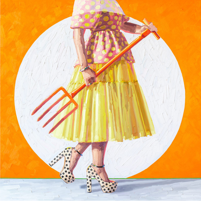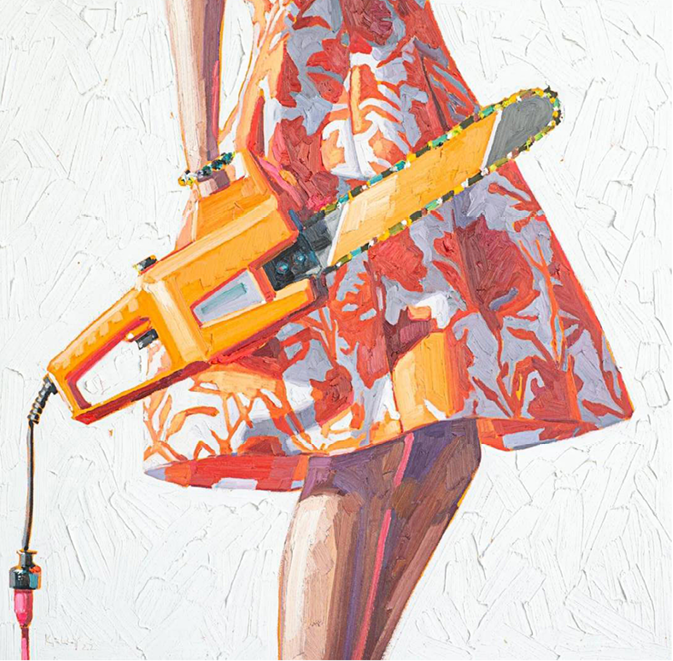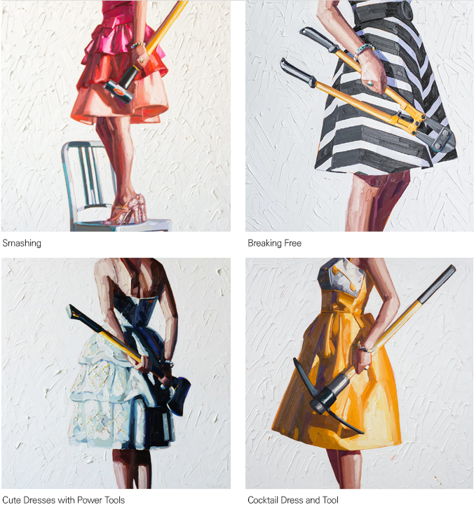 미국 작가 '켈리 림츤'의 작품에는 언제나 화려하게 차려입은 여성과 그 손에 쥐어진 묵직한 공구가 등장한다. 드레스 자락은 부드럽게 펼쳐져 있고 손끝에는 전기톱, 도끼, 해머 등의 공구들이 강렬하게 빛난다. 그녀의 작품 속 공구는 단순한 소품이 아니다. 캔버스 한가운데에 자리하며 작품의 무게 중심을 잡고 동시에 강력한 상징성을 표현한다. 여성성을 대표하는 드레스와 남성적 노동의 이미지를 지닌 공구가 같은 화면에 존재하면서 강렬한 대비를 형성해 낸다. 그리고 그 대비 속에서 이야기는 만들어진다. 결국 그녀의 작품은 하나의 선언처럼 읽힌다. “여성에게도 힘이 있다. 공구를 쥔 손이 남성의 전유물이 아니듯 드레스를 입은 손 역시 망치를 들 수 있다.” 하는 선언 말이다.