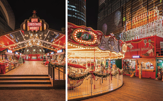 서울 잠실의 겨울밤을 가장 화려하게 수놓는 롯데월드몰에서 매년 사랑받는 크리스마스 마켓이 열린다. 수천 개의 불빛으로 장식된 광장은 유럽의 크리스마스 마켓을 모티브로 꾸며져, 한낮에도 로맨틱하고 밤에는 더욱 극적인 분위기를 자아낸다. 반짝이는 대형 트리와 알록달록한 목재 부스들이 어우러진 공간에서는 핫초코, 독일식 뱅쇼, 크리스마스 오너먼트 등 다양한 시즌 아이템을 만날 수 있다. 마켓 곳곳에는 대형 트리와 LED 조명, 캐릭터 조형물이 설치되어 쇼핑과 휴식을 동시에 즐길 수 있는 공간으로 꾸며져 있다. 잔디 광장에서는 캐럴 공연과 버스킹, 어린이 체험 프로그램이 열리며, 주말 저녁에는 미디어 파사드 쇼가 더해져 겨울밤의 낭만을 완성한다. 서울 도심 한가운데에서 즐기는 특별한 크리스마스의 설렘을 느껴보자.