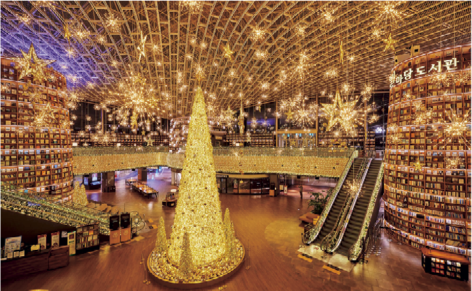 서울 한복판에서 실내 크리스마스를 즐기고 싶다면 코엑스 별마당 도서관이 제격이다. 30미터에 달하는 책장 사이로 황금빛 트리와 조명이 어우러진 ‘골든 크리스마스’는 매년 SNS를 뜨겁게 달구는 명소다. 천장까지 닿는 대형 트리와 눈이 내리는 듯한 미디어 연출이 더해져 도서관 전체가 한편의 겨울 동화처럼 변신한다. 낮에는 독서와 휴식을 즐기는 이들로, 밤에는 클래식 선율과 함께 황금빛 아래 인생샷을 남기려는 방문객들로 붐빈다. 올해는 100여 종의 팝업북을 감상할 수 있는 전시와 다양한 체험 프로그램도 마련돼 있다. 책 향기와 불빛이 공존하는 이곳, 조용하지만 가장 따뜻한 크리스마스 공간에서 한 해를 차분히 마무리해보자.