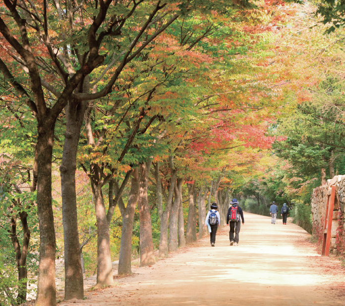 이런저런 볼거리도 많지만, 문경새재의 참맛은 걷는 그 자체에 있다. 특히 1관문과 2관문 사이 3km 구간은 길도 넓고 평탄한 데다 매끄러운 흙길로 이루어져 신발을 벗고 걷는 맛이 그만이다. 맨발로 지그시 밟는 마사토의 까칠함이 좋을뿐더러 발바닥 지압효과로 피로 해소에도 좋다니 일석이조다. 조곡관을 지나면 굽이굽이 똬리를 틀며 이어진 고갯길이 약간 가파르게 이어지지만, 한층 깊어진 숲에 고즈넉함이 배어 있다. 문경새재 아리랑비를 지나 ‘장원급제길’이라 이름 붙은 좁은 길로 접어들면, 돌을 책처럼 쌓아 놓은 책바위도 볼 수 있다. 지름 2m, 높이 2m 크기의 돌탑으로, 그 옛날 선비들이 급제를 기원하던 곳이자, 해마다 입시철이면 수많은 사람이 찾아와 합격을 기원하는 곳이다. 이곳을 지나 제3관문인 조령관을 넘어서면 충북 괴산 땅이다.