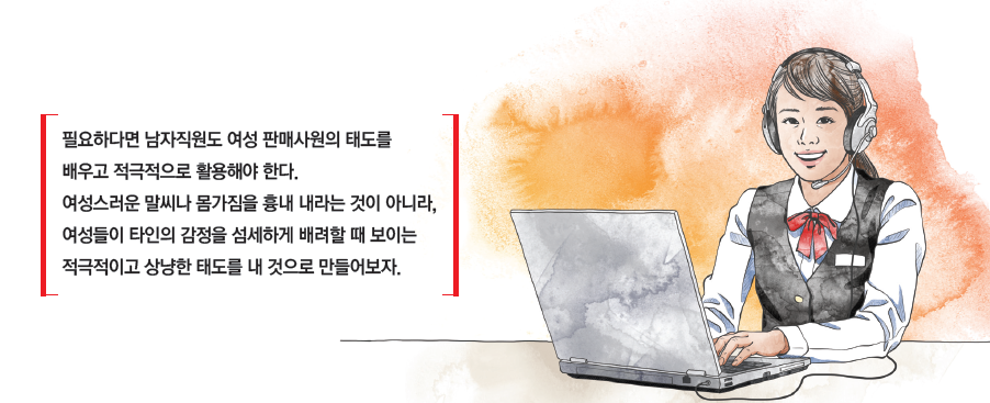 같은 물건이라면 이왕 기분 좋은 서비스를 받고 싶어 하는 것이 성별을 떠난 고객의 본능이다. 필요하다면 남자직원도 여성 판매사원의 태도를 배우고 적극적으로 활용해야 한다. 여성스러운 말씨나 몸가짐을 흉내 내라는 것이 아니라, 여성들이 타인의 감정을 섬세하게 배려할 때 보이는 적극적이고 상냥한 태도를 내 것으로 만들어보자.