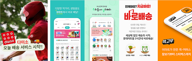 수년 전만 하더라도 온라인 쇼핑몰에서 상품을 구매하면 2일에서 3일 정도 걸려 택배를 통해 받아야 했다. 쿠팡이 로켓배송을 가지고 혜성처럼 유통시장에 등장하면서 이제 이커머스에서 상품 구매 시 당일 또는 다음 날 아침이면 주문한 상품이 도착한다. 쿠팡의 로켓배송은 유통 구매의 기준이 되었고, 네이버쇼핑, G마켓, 11번가 등 주요 유통기업도 빠른 배송을 도입하게 만들었다. 쿠팡은 2024년 41조 2,901억 원의 매출 실적을 올리며 2위 이마트의 29조 209억 원 매출을 10조 이상 따돌리며 유통기업 1위에 등극했다. 국내 유통시장을 지배했던 롯데, 신세계, 현대 등의 유통 대기업은 쿠팡의 빠른 배송 서비스에 무너졌다고 말할 수 있다. 이제 오프라인 유통기업도 배송의 중요성에 대한 인식이 바뀌며 빠른 배송에 대응 방안으로 퀵커머스를 주목하기 시작했다.