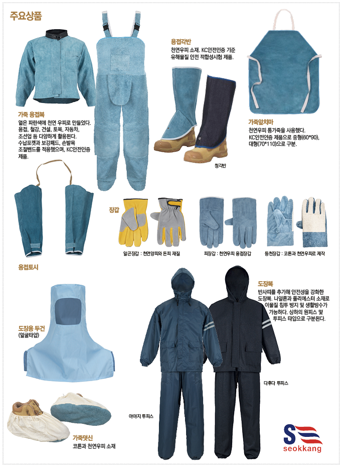 석강은 작업복, 용접복, 도장복 등 의류 종류만 15개 품목을 생산하고 있다. 장갑은 10개 품목으로 구분된다.