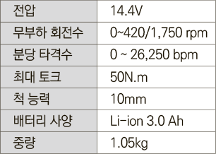 BL14T50 2G는 작업자의 편의성을 고려한 인체공학 설계로도 산업 현장에서 큰 호응을 받고 있다. 미끄럼 방지 처리된 넓은 그립을 가져 손끝 조작감이 뛰어나다고. 1.05kg의 가벼운 본체에 균형 잡힌 무게 배분을 가졌으며 아임삭 고유의 기능성 그립인 ‘i LESS GRIP’으로 장시간 사용해도 손의 피로가 적다. 한국인의 손에 딱 맞는 다재다능한 신제품이다.