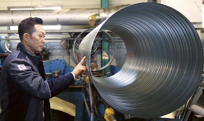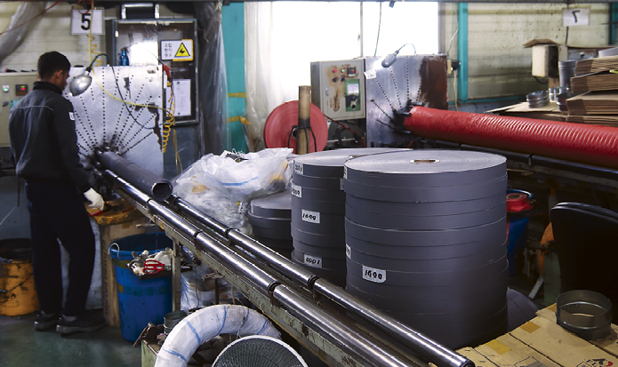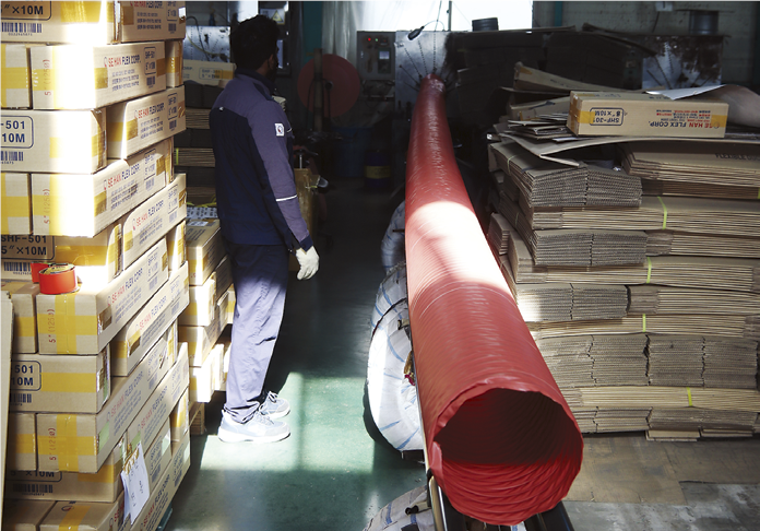 “제대로 만든 플렉시블 덕트는 건설 현장에서 바로 티가 납니다. 좋은 제품은 재료가 충실히 들어가야 하고 상황에 따라 보온 단열 효과 내습성과 방염성이 필요하죠. 가격과 겉모습만 보고 제품을 구매하고 사용해서는 안 됩니다. 플렉시블 덕트는 제작에 사용된 원단과 탄소체강선의 굵기, 강선 간격이 품질에 영향을 줍니다. 플렉시블 덕트 형태는 원단에 탄소체강선을 나선식으로 접착하여 만들죠. 탄소체강선에 원단을 둘렀다고 생각하시면 됩니다. 저가형의 경우 강선 간격을 넓게 늘린 형태죠. 그렇게 되면 강선을 적게 사용할 수 있지만 내구성이 떨어집니다.”