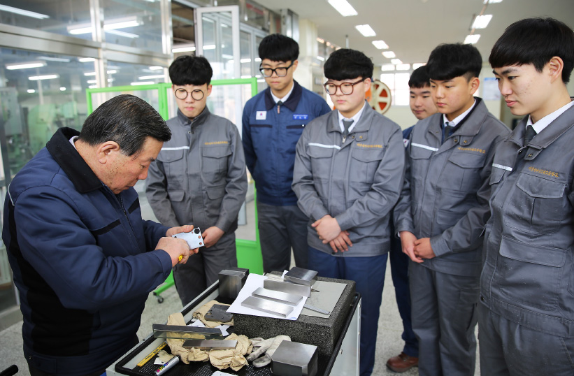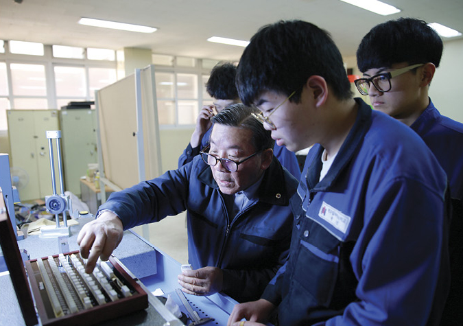 꼼꼼하고 세심하게 기술을 전수하고 있는 곳은 바로 대구 일마이스터고 사출금형기능반의 기능영재반 수업현장이다. 마침 지방기능경기대회 선수로 선정된 2학년 학생을 대상으로 금형수업이 진행되고 있었다.