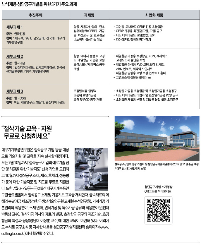 연구원과 한국공구공업협동조합, 16개의 절삭공구 분야 산·학·연 기관이 추진하고 있는 본 사업은 2016년 6월부터 2021년 5월까지 국비, 시비, 민자 등 총 635억원을 투자해 세계 최고 수준의 난삭재 가공용 첨단공구를 개발한다. 수입에 의존하고 있는 첨단공구의 국산화와 글로벌 공구시장 선점을 목표로 하고 있다. 올 6월부터 11월까지는 연면적 4,450㎡에 308억원을 투입해 대구 성서산업단지에 첨단공구기술지원센터를 준공할 예정이다. 지상 3층에 연구동 2개층, 사업동 3개층 규모다. 센터는 핵심 제조공정의 연구개발, 시제품제작 등 지원을 위해 19종 40여대의 고가 장비를 도입하게 된다. 공구에 대한 신뢰도, 내구성 검증을 위한 평가도 지원한다. 업계는 첨단공구기술지원센터를 통해 대구가 첨단공구 분야의 전국적 산업육성 거점이 될 것으로 기대하고 있다. 공구생산 최대 지역인 대구에는 대구텍, 한국OSG, 쌍용머티리얼, 신생공업 등 첨단공구 제조분야에서 기술혁신을 보유한 기업과 유통기업인 크레텍, 케이비원 등이 자리하고 있다.