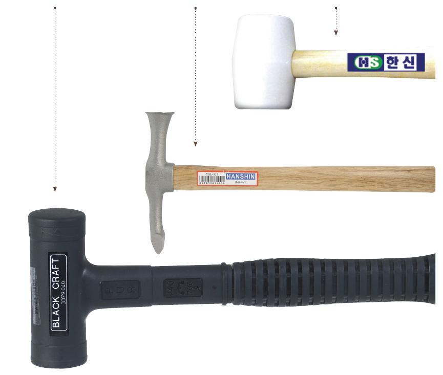 목제로는 작은 것에 나무망치, 큰 것으로는 말뚝박기 등에 사용하는 메 등이 있으며, 철제로는 목공용 망치, 세공용 망치, 철공용의 한손 해머, 판금용 해머 등이 있다. 또 각종 공사용 해머, 직종에 따른 망치류(구둣방용·유리점용 등)도 있다. 지금부터 다양한 망치의 세계를 들여다 보자.