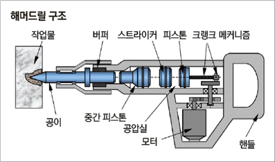 ③ 해머드릴의 특징 : 해머드릴은 드릴과 작업물이 만나는 면에 수직으로 강한 타격을 주는 드릴이다. 임팩트드릴은 공이과 이음쇠에 의해 타격이 행해진다면 해머드릴은 장착된 실린더 속의 크랭크 움직임에 의해 타격력이 발생한다. 해머드릴의 타격은 직접적으로 이루어지지 않고 공기압력이 에너지를 전달하는 해머링을 사용한다. 마치 망치로 때리는 듯한 직선운동으로 스트라이커가 타격하므로 ‘해머드릴’이라는 이름이 붙은 것이다.