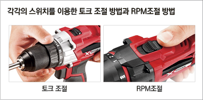 ③ RPM조절 스위치 : 회전 속도를 변속하는 스위치. 1단은 속도에 치중한 작업을 할 때, 2단은 힘에 치중된 작업을 할 때 주로 사용한다.