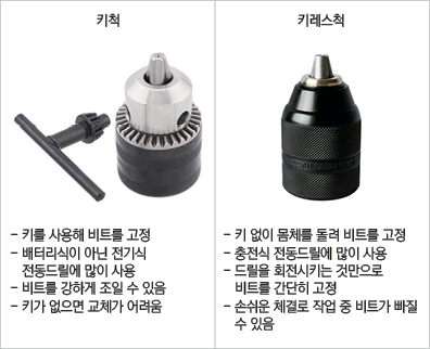 척은 비트를 고정시키는 부분으로 크게 키척과 키레스척(키리스척)으로 나뉜다. 각각 방식에 따라 장단점이 분명하다. 키척과 키리스척의 특징과 장단점은 다음과 같다.