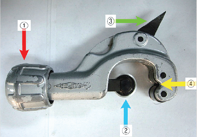 ① ②번 Tube cutter Wheel을 상 하로 조절할 수 있으며 ①번 손잡이
