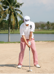 박현빈은 "볼보다 모래를 먼저 타격하는데 어느 지점을 타격해야 하는지 잘 모르는 아마추어골퍼가 많다"고 말했다. 타격 지점이 볼에 가까우면 모래를 얇게 퍼 볼을 멀리 보내거나, 반대로 멀면 모래에 클럽이 박혀 볼을 전혀 띄우지 못한다. 때문에 벙커샷에서는 어느 지점을 타격하느냐가 중요하다. 박현빈은 "볼 뒤 2~3cm 지점을 목표로 정한다"며 "클럽이 모래에 닿는 순간 일어서지 말고 모래를 한가득 퍼낸다고 생각하면 자연스럽게 볼이 벙커 밖으로 나간다"고 소개했다.