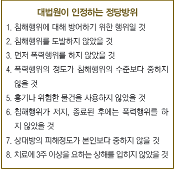 대법원은 이와 같은 기준을 모두 충족하는 경우에 정당방위로 판단하고, 요건 중 일부를 충족하지
