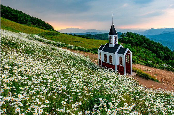 흔히 계란후라이꽃이라 불리는 샤스타 데이지는 6월 중순부터 7월 초까지 만개하며 6월말에 절정이다.(좌) 10월에는 샤스타데이지가 지고, 푸른 초원과 갈대, 산등성이가 어우러진 고원 풍경이 펄쳐지며, 평균 6시에 해가 져 밤 관측에 적합한 환경이 일찍 조성된다.(우)