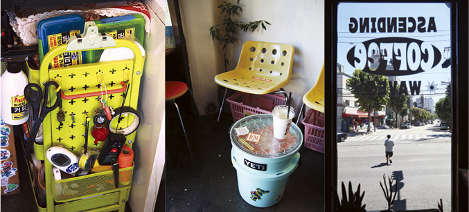 “저희 카페는 40년 넘은 철물점 건물을 개조해 직접 리모델링했어요. 인테리어 소품이나 선반은 40년 동안 원래 주인분이 쓰시던 것입니다. 동네 표구사에서 얻은 물건, 거리에서 우연히 주운 스케이트보드 등 빈티지 아이템 위주로 꾸몄어요. 공동 대표로 함께하는 아내의 본업이 디자이너인데요. 있는 것과 오래된 것을 살리고 여행하며 수집한 소품이나 빈티지 옷, 컵 등 이야기가 담긴 물건을 모아두었습니다. 저희 부부는 옛것에 남다른 애정을 가지고 있죠.”