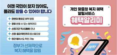 6000종의 공공서비스를 개인의 상황에 따라 맞춤형으로 알려주는 '혜택알리미' 서비스가 지난 25년 12월 10일부터 본격 운영에 돌입했다. 혜택알리미는 소득, 거주지 등 개인의 상황을 파악해 받을 수 있는 정부 지원 정책인 공공서비스를 찾아 안내해 주는 알림서비스다. 공공 통합포털인 정부24와 기업은행, 신한은행, 하나은행, 우리은행, 웰로(Wello) 등 5개 민간 앱에서 혜택알리미를 가입·이용할 수 있다. 장애인·노인·차상위계층 등 취약계층뿐 아니라 1인 가구, 무주택자, 소상공인, 중장년층 등 다양한 직업과 환경에 있는 사람도 정부에서 제공하는 공공서비스를 놓치지 않고 받을 수 있다.