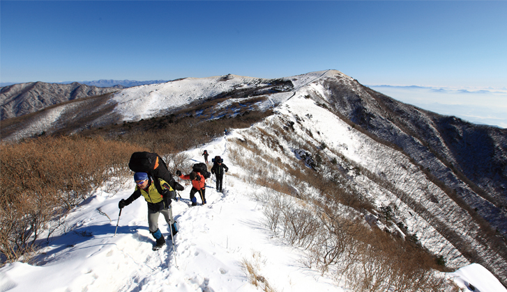 본격적 산행에 나섰건만 그때까지도 등산(登山)한다기보다 입산(入山)한다는 기분이 드는 까닭은 그만큼 이 산의 품이 크다는 것일 테고, 무엇보다 우리가 오를 길이 그만큼 길다는 것일 테다. 능선은 쉽게 자신을 내주지 않았다. 지천이 눈밭이다. 갈증이 나는 것도 아닌데 괜스레 흰 눈을 한 주먹 입 안에 털었다. 그러고도 나른한 산굽이를 한참 더 올랐다.