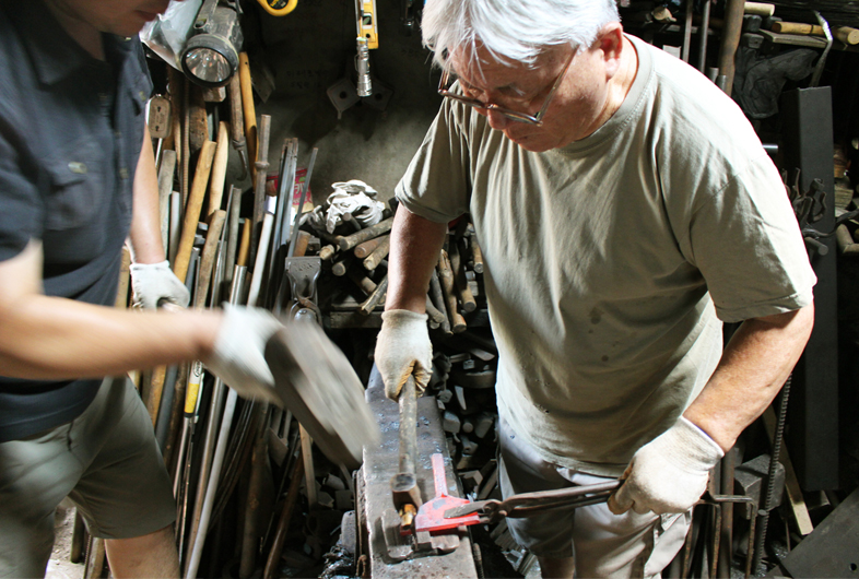 “요즘에 누가 직접 메질(망치질)해서 연장을 만들겠어. 다들 프레스로 찍어 내고 딸딸이 햄머(전동 단조기)로 때려 만들고 말지. 그런데 그렇게 해서는 제대로 된 물건이 안 나와. 쇠를 불가마에 여러 차례 달구고 모루에 올려 때리고 해야 쇠질이 조밀조밀해 지면서 강도도 생기고 잘 안 망가지거든. 그래서 단조가 좋다는 거야.”