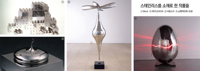 “20년 동안 스테인리스를 주로 다뤄왔어요. 스테인리스는 일반 철처럼 산화되거나 부식되지도 않고, 환경에 영향을 잘 받지 않아 오래 그 상태를 유지할 수 있어요. 조금 비싸긴 하지만 강도가 세고 현대적인 이미지를 주기 때문에 작품에 적합하다는 생각을 했어요.”