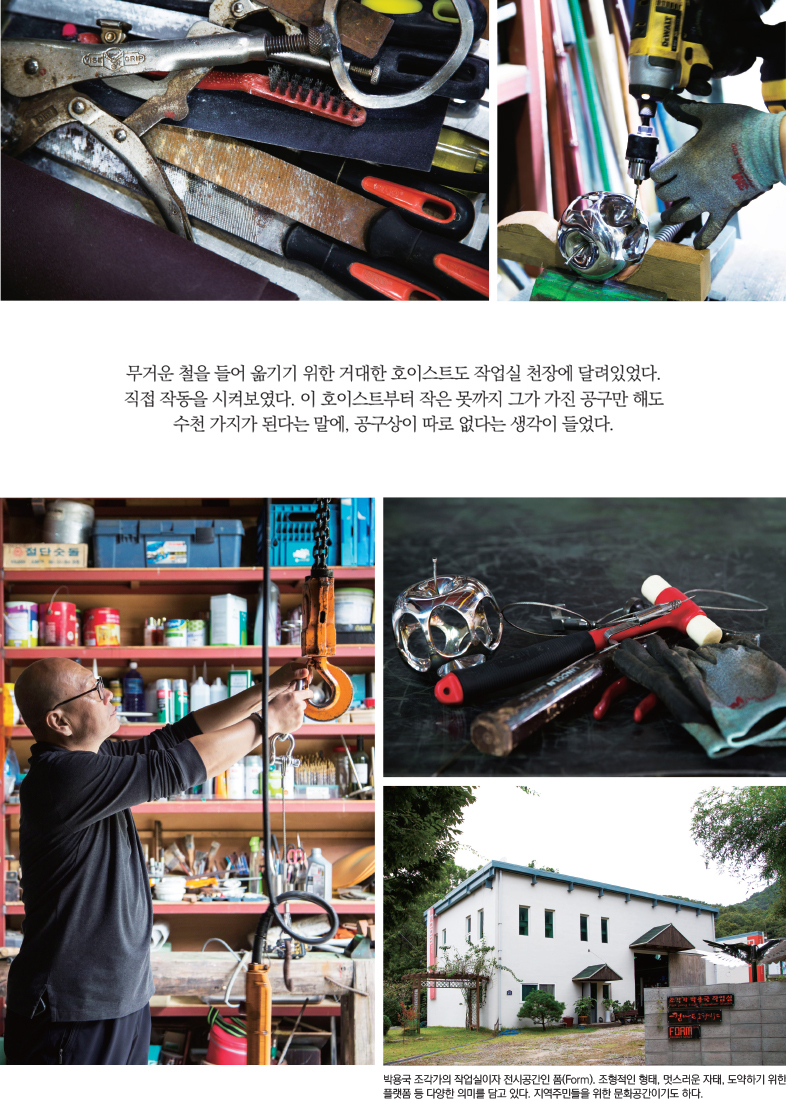 무거운 철을 들어 옮기기 위한 거대한 호이스트도 작업실 천장에 달려있었다. 직접 작동을 시켜보였다. 이 호이스트부터 작은 못까지 그가 가진 공구만 해도 수천 가지가 된다는 말에, 공구상이 따로 없다는 생각이 들었다. 이렇게 수많은 공구들로 스테인리스를 자르고 다듬을 때는 분진과 소음이 발생하기 마련이다. 그가 거주하고 있는 수원지역에는 큰 작업실을 열 수가 없어 10년 전, 30분 거리의 화성 산골에 들어오게 됐다고 했다. 자연 속에서 현대적인 쇠를 다루는 것이라니, 목재로 지어진 작업실과 그 옆 컨테이너 전시실 또한 조금은 어색한 듯 서로 특별한 조화를 이루고 있었다.