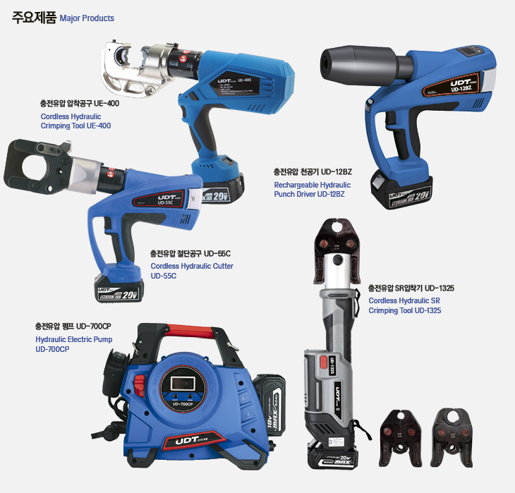 UDT충전유압의 핵심 제품군으로는 충전유압 압착공구, 충전유압 절단공구, 충전유압 천공기, 충전유압 SR압착기, 충전유압 펌프 등이 있다. 그 외 각종 수동·전동 배관 설비 공구 등 다양한 품목을 생산하고 있다.