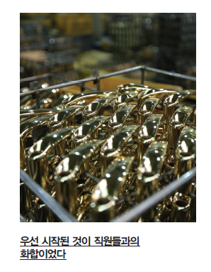 “상하관계를 같이 묶여 있을 때는 말하는 것에 한계가 있어요. 그래서 직급별로 대리급이면 대리급끼리 묶어 놓고 이야기를 하고 그러죠. 무엇이 바뀌었으면 좋겠는지 어떤 것을 필요로 하는지. 네이버 밴드 안에서만큼은 직원들 모두가 형 동생처럼 의사소통해요. 제가 좋은 글을 올리면 서로 농담도 하고. 하루에 서너 편씩 제가 좋은 글을 올리고 서로 함께 같은 글을 보고 이해하고 그러죠. 공장은 대구에 있지만, 서울 사무소에도 제가 자주 출근을 해야 하거든요. 매일 대구에서 직원들 얼굴을 볼 수 없으니까 그렇게라도 직원들과 가까이하려고 노력하고 있습니다.”