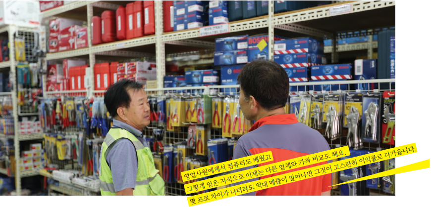 "저희는 손님들이 원하는 원스톱으로 구매를 할 수 있는 시스템을 갖추었죠. 물론 그렇게 하기란 대단히 힘이 듭니다. 공구상가나 공구거리에 있으면 다른 업체에서 물건을 빌릴 수도 있지요. 그렇게 하면 편하게 장사를 할 수 있었겠죠. 그런데 그만큼 이익도 안나고 물건 마련에도 시간이 걸려요. 장사를 하는데 편하게만 해선 안되죠. 손님이 원하는 방향대로 움직여 주어야 합니다. 저희는 얼마 전부터 첫째 셋째주 일요일만 쉬지 그 전에는 일요일에도 문을 열어 놓았어요. 큰 기업에서나 주 5일 근무로 쉬는 것이지 작은 건설현장이나 업체는 주말에도 일을 합니다. 그분들에게 맞추어서 저희도 일요일에 문을 열었죠. 대신 배달은 못하고 물건을 사 갈 수만 있게 했어요. 형제끼리 돌아가면서 쉬었으니까 2주에 하루 쉬는 셈이었네요."