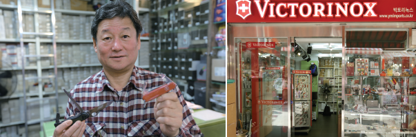 “저희 가게에서는 빅토리녹스 전 제품을 보고 확인하고 구매할 수 있어요. 인터넷에서 물건을 보고 사는 것은 그 물건이 어떤 크기인지 어떤 무게인지 알기란 힘들거든요. 빅토리녹스 다용도칼이 한 가지 종류만 있는 것이 아니라. 목적이나 쓰임에 따라 다양하게 제작이 됩니다. 단순한 기념품이 아니라 실용적으로 쓰이기 위해 제작된 칼 이예요. 낚시, 요트, 캠핑, 사냥, 구조 등 다양한 상황에 따라 제작되는 것이 맥가이버 칼입니다. 그래서 어떤 고객분은 저 멀리 지방에서 여기까지 찾아와서 칼을 구입해가곤 합니다. 작지만 강력한 자신의 목적에 맞는 다용도 칼을 구하기 위해서죠.”