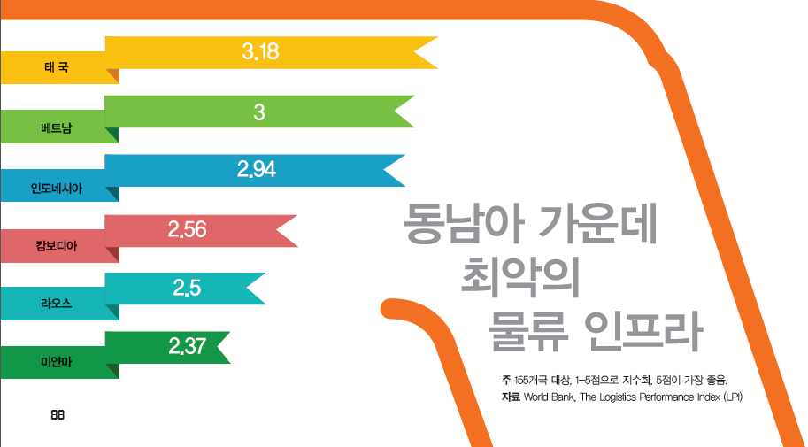 물리적 투자제약요인으로는 인프라 부족을 빼놓을 수 없다. 지난 ’62년 이후 외부세계에 문을 닫은 미얀마는 도로, 전력, 용수 등 모든 인프라 부문이 낙후되어 있다. 도로망은 경제발전을 위해서 최우선적으로 개선되어야 할 분야이다. 미얀마 도로의 포장률은 50% 미만에 그치며, 주요 도시를 벗어나면 포장률은 10% 미만으로 떨어진다. 세계은행(WB)에서 발표하는 물류지수(LPI : Logistics Performance Index)에서 미얀마의 수준은 최하위에 머문다. 지난 ’12년 기준 미얀마의 물류지수는 5점 만점에서 2.37점으로 155개국 가운데 129위에 해당되며, 역내 국가 가운데서도 최하위이다.