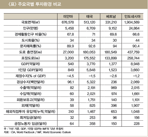 때문에 개혁 개방에 나선 미얀마 시장에 대해서 과도한 기대를 갖기 보다는 동남아 경제권의 분업구도 내에서 제조기지로서의 역할에 우선 주목해야 할 것이다.