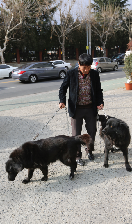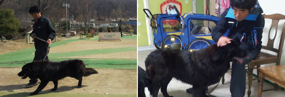 "짱이가 3살 무심이가 4살 이렇게 되었어요. 제가 자주 찾아뵙는 스님꼐서 몇 해 전 티벳을 다녀오시고 한국에 돌아오시면서 짱이와 무심이를 데려왔습니다. 그러다가 스님이 다시 외국에 가셔야 한다는 거에요. 스님의 권유로 제가 이 개들을 키우게 된 것이죠. 스님꼐서는 마스터프 짖는 소리가 꼭 복을 부르는 소리 같다며 제게 주시더군요. 예전에는 개를 키워볼 기회가 없었죠."