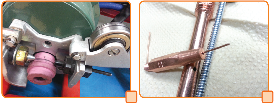 A. 토치의 각종 소모품(팁, 노즐, 디피셔, 스프링)의 상태를 점검 후 교체를 바랍니다. 라이너 스프링이 너무 길 경우 와이어 송급에 영향을 미칠 수 있으므로 적정길이 만큼 절단 후 조립하시길 바랍니다.