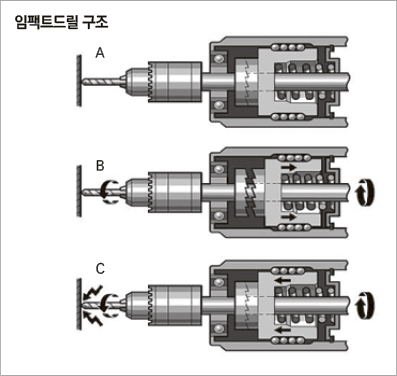 ② 임팩트드릴의 특징 : 임팩트드릴은 설명했던 것처럼 전동드릴의 회전력에 ‘타격력’을 더해 단단한 재질에 구멍을 쉽게 맬 수 있게 돕는 공구다. 석재·콘크리트 벽에 구멍을 뚫거나 또는 녹슨 나사·볼트를 풀 때 탁월하다. 오른쪽의 구조도에서 볼 수 있다시피 구조적으로 회전하는 공이와 이음쇠의 타격으로 인한 타격력을 생성한다. 샤프트에 달린 공이(스트라이커)가 이음쇠를 회전시키면서 상하왕복하여 비트에 타격을 주는 방식으로 작동한다.