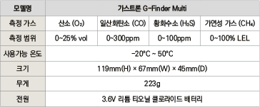 가스트론 G-Finder Multi도 산소· 일산화탄소·황화수소·가연성 가스를 동시 측정 가능한 복합가스측정기다. 타사의 복합가스측정기와 마찬가지로 시각/청각/진동으로 경보를 울리는데 블루투스 5.0을 지원해 연동된 휴대폰으로도 경보 알림이 가능하다. 128건의 이벤트 로그를 저장 가능하며 IR Link(적외선 링크)로 데이터 다운로드가 가능하다. 방진 방수 IP68등급을 받은 제품이다.