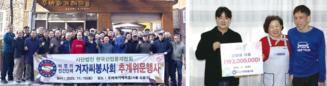 센터)’을 방문해 추계 위문행사를 진행하고 난방비 300만 원을 지원했다. 이날 행사에는 한국산업용재협회 겨자씨봉사회 회원들이 함께 참여해 센터 이용자들과 따뜻한 교류의 시간을 가졌다. 겨자씨봉사회는 매년 지역 복지시설을 대상으로 실질적인 지원과 봉사활동을 이어오고 있다. 홍영표 회장은 “겨울철 난방비 부담이 커졌다는 소식을 듣고 회원들과 뜻을 모았다”며 “지역사회와 더불어 따뜻한 겨울을 만드는 데 도움이 되길 바란다”고 말했다. 주바라기해피홈 관계자는 “겨울 준비로 가장 부담되는 난방비를 지원받아 큰 힘이 된다”며 “후원해주신 따뜻한 마음을 잊지 않고 센터 운영에 소중히 쓰겠다”고 감사의 뜻을 전했다.