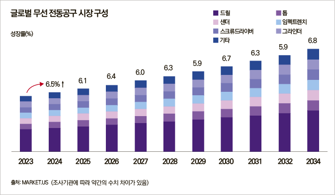 중·저강도 응용 분야에서는 유선보다 무선 공구가 점차 대체되고 있으며, 더 높은 출력 및 배터리 성능 향상으로 고강도 분야까지 확대될 가능성이 커지고 있다.